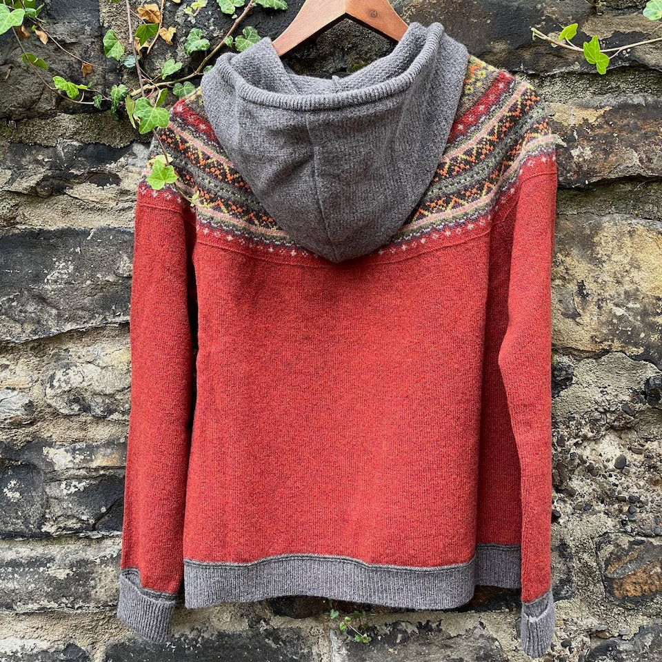 Wunderschöner, weicher Wollpullover mit Kapuze von Eribé aus Schottland. Ein lässiges Kleidungsstück, das wunderbar wärmt. Der Pullover ist aus kuschelig, weicher Lammwolle und mit seinem zauberhaften FairIsle Muster ein echter Hingucker.